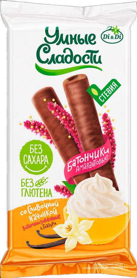 Безглютеновые батончики со сливочной начинкой в глазури-не содержат сахара, глютена и дрожжей. Изготовлены из полезной амарантовой муки, насыщенной белком и большим количеством клетчатки. Кукурузная и рисовая мука входящие в состав, обладают высоким содержанием витаминов и минералов, а присутствующий в составе топинамбур полезен для пищеварительной системы и богат кальцием. Покрыты ароматной кондитерской глазурью. В составе натуральный подсластитель на основе стевии.
