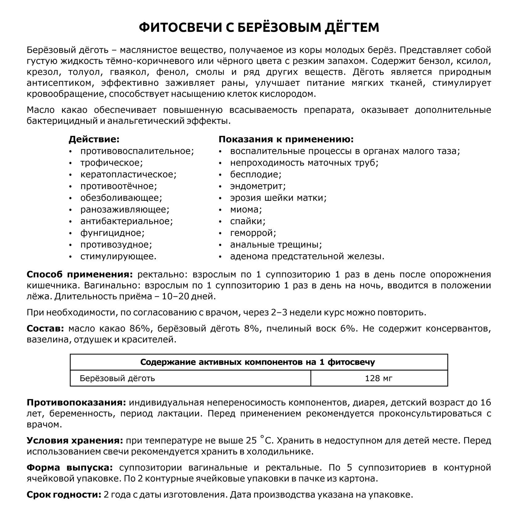 Свечи на основе бёрёзового дёгтя и масла какао незаменимы в решении множества гинекологических, урологических и проктологических проблем, а именно: в лечении часто рецидивирующих и трудноизлечимых воспалений, опухолей, кист, миом, эндометриоза, бесплодия, спаечных процессов, геморроя, болезненных ран и трещин анального отверстия, аденомы предстательной железы.