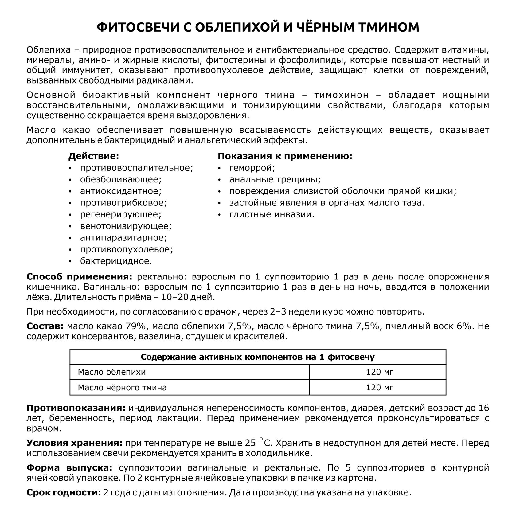 Свечи с облепихой и чёрным тмином очень эффективны при различных воспалительных процессах, особенно, при геморрое. Входящие в состав суппозиториев концентраты масел облепихи и чёрного тмина оказывают выраженное антиоксидантное, противовоспалительное, болеутоляющее, венотонизирующее, антипаразитарное действие, нормализуют обменные процессы, восстанавливают поврежденные ткани, способствуют укреплению сосудистых стенок, устранению патогенной флоры и застойных явлений в органах малого таза.