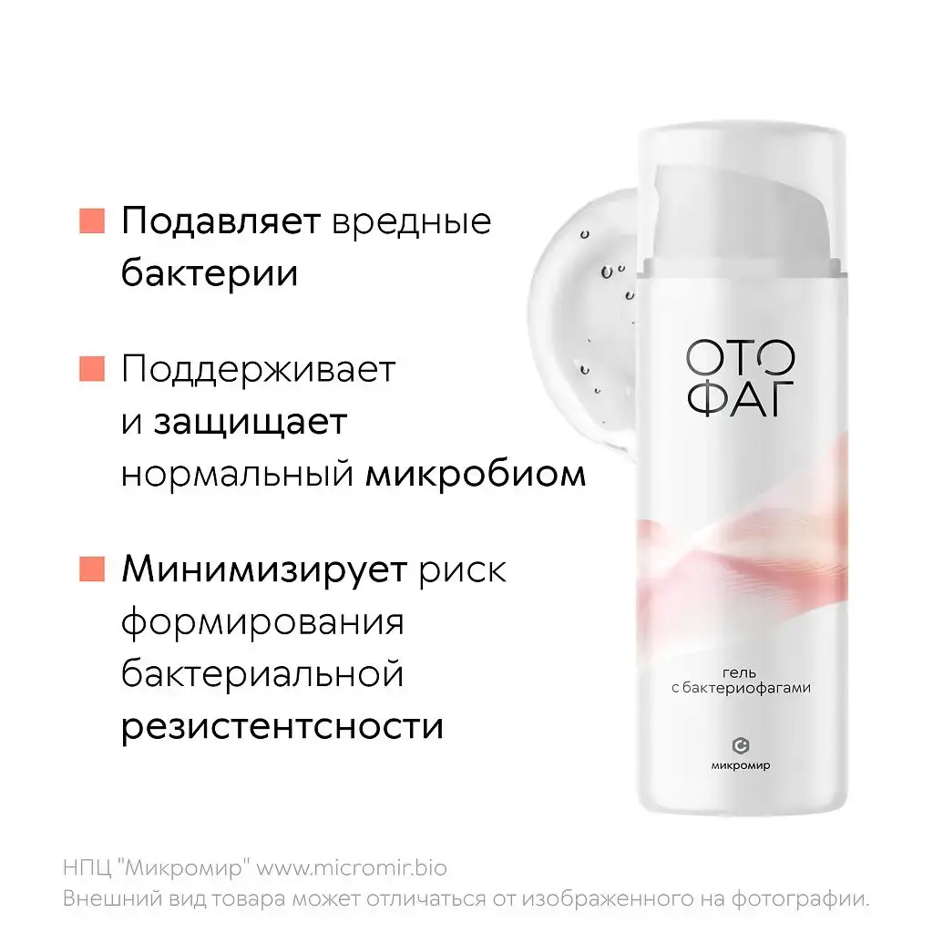 Гель с бактериофагами для гигиены кожи ушных раковин «Отофаг» (далее – Отофаг) применяют с целью нормализации микрофлоры. Отофаг способствует предотвращению развития гнойно-воспалительных заболеваний бактериальной этиологии уха, горла и носа. Отофаг содержит комплекс из 72 видов бактериофагов коллекции ООО НПЦ «Микромир», подавляющих рост актуальных штаммов.